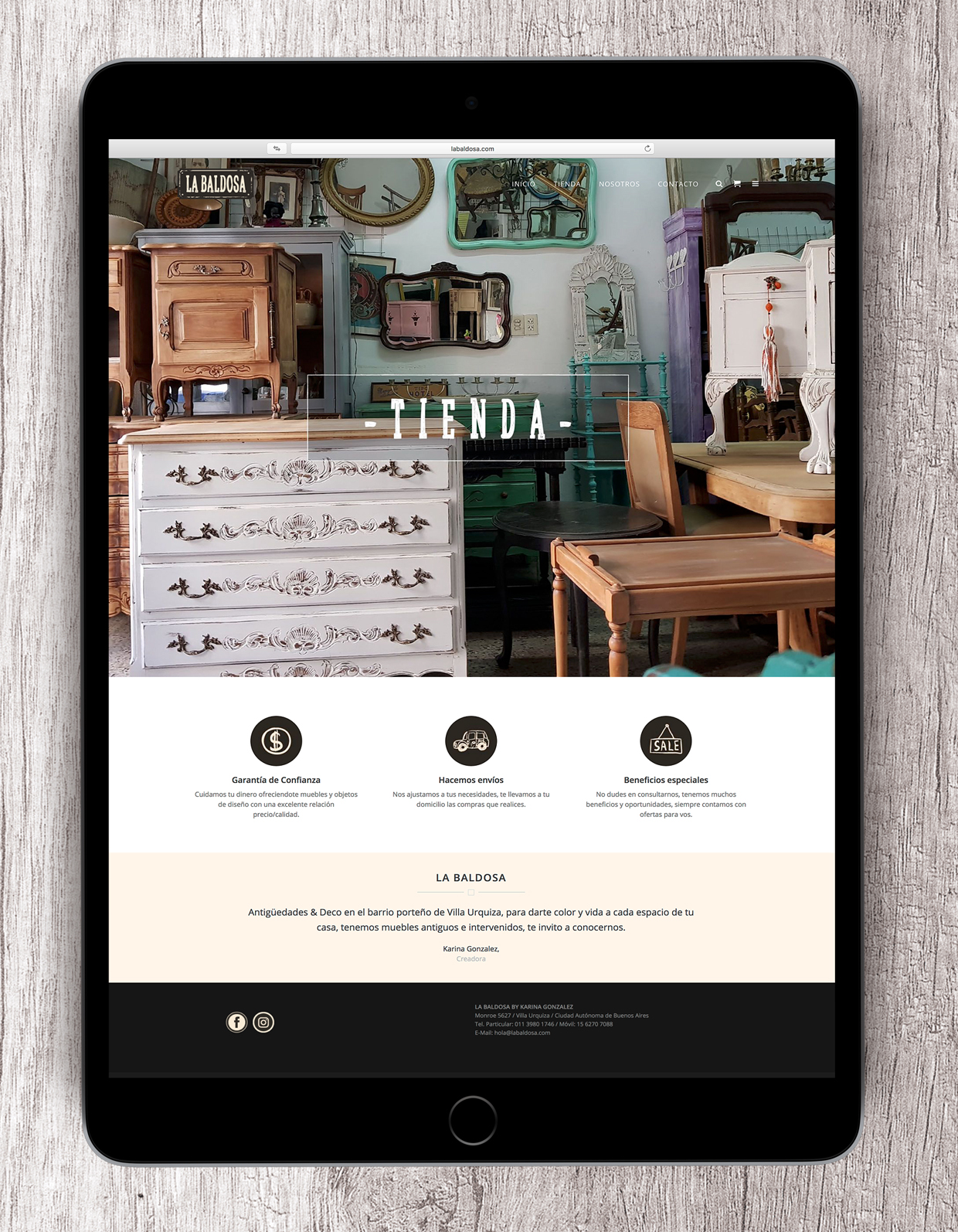 Karina Gonzalez es la creadora de La Baldosa Antigüedades y Decoración, una mueblería boutique ubicada en el barrio porteño de Villa Urquiza. Hemos trabajado en equipo con Karina para realizar su marca con un estilo vintage el cual representa la esencia de sus gustos estéticos. Además diseñamos un sitio responsivo para que se pueda visualizar desde cualquier dispositivo (escritorio-tablet-móvil) agregándole un carrito de compras con conexión a sus redes sociales.
